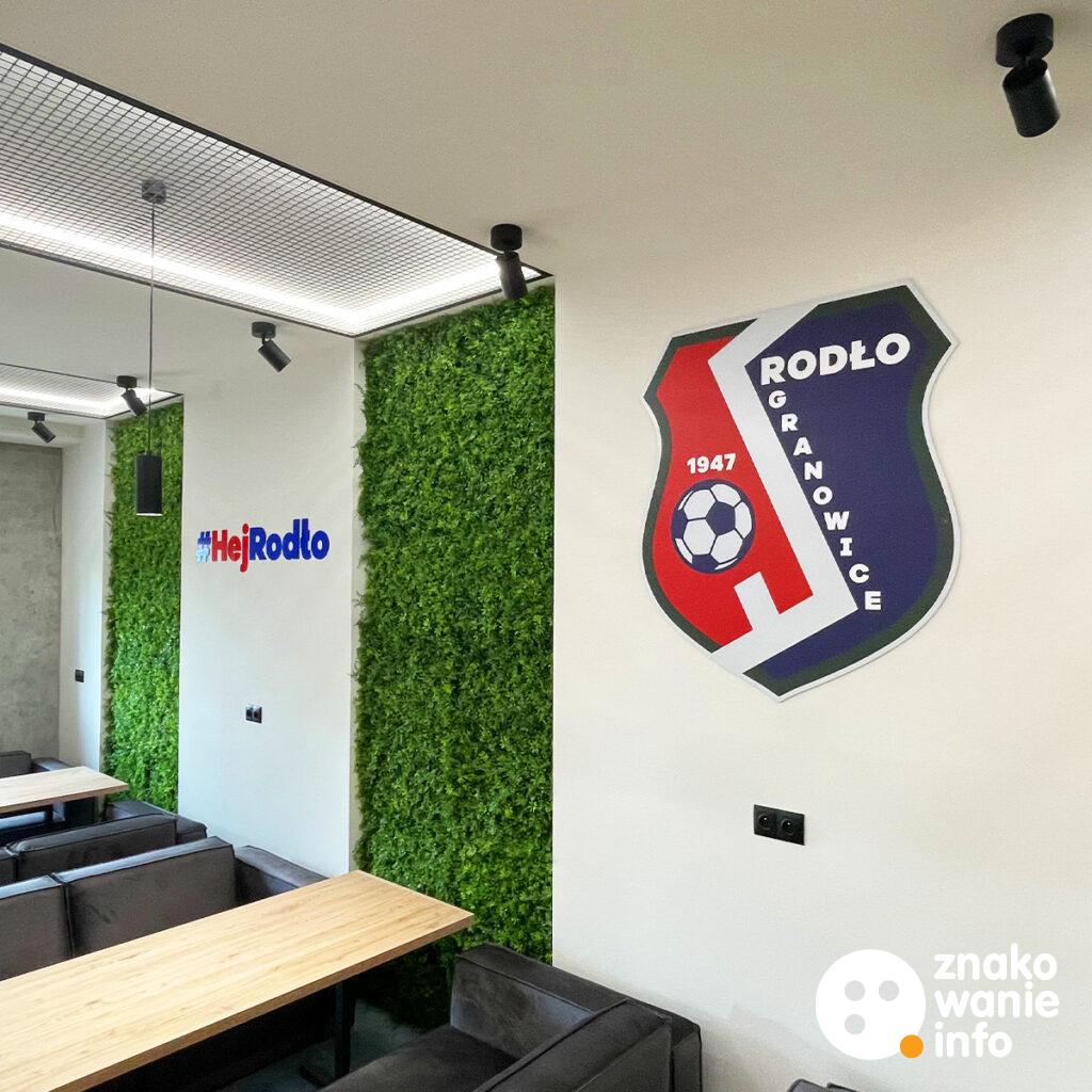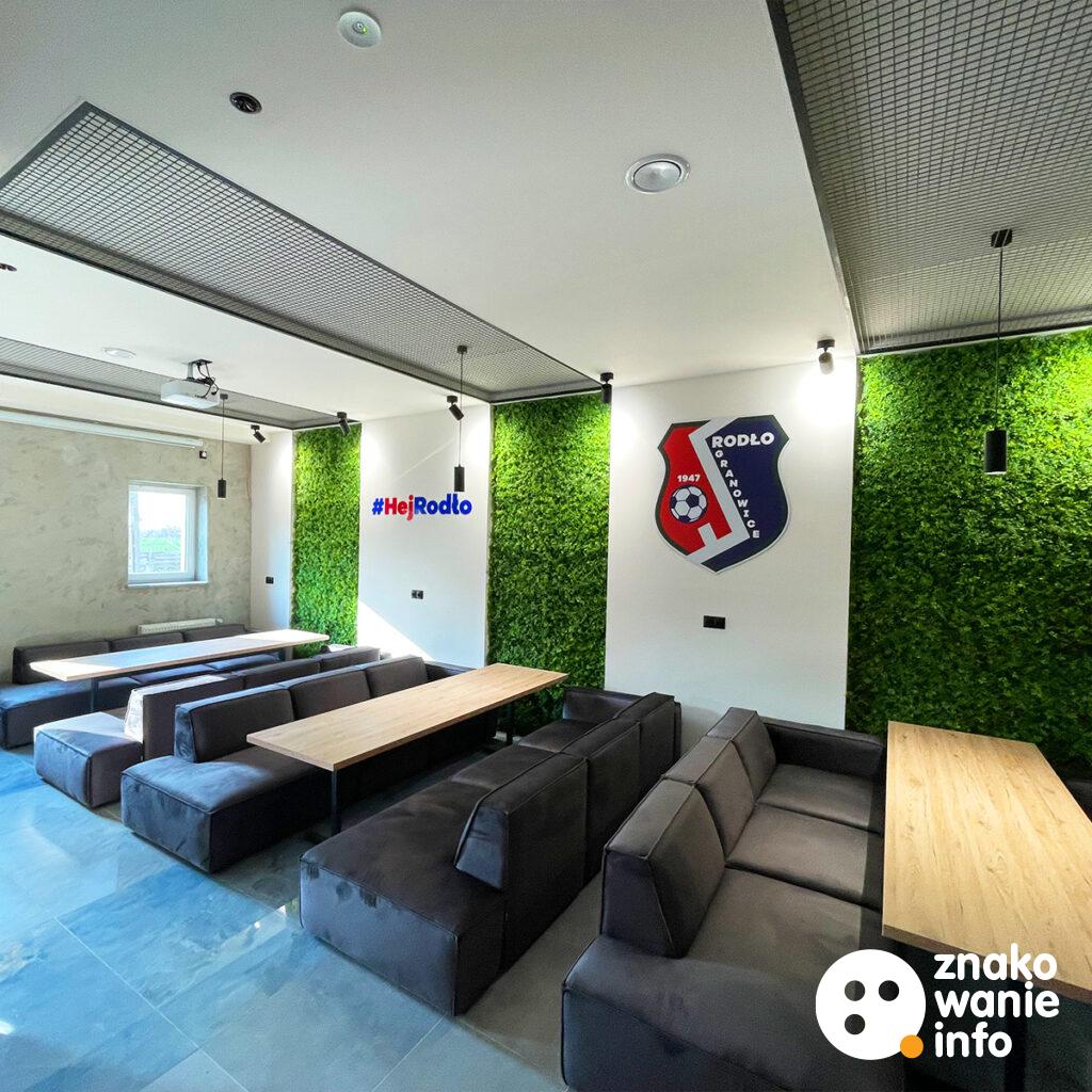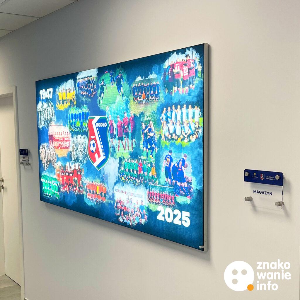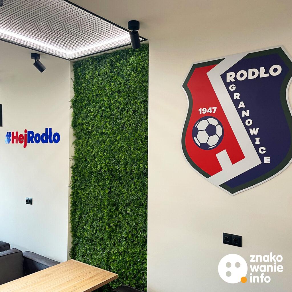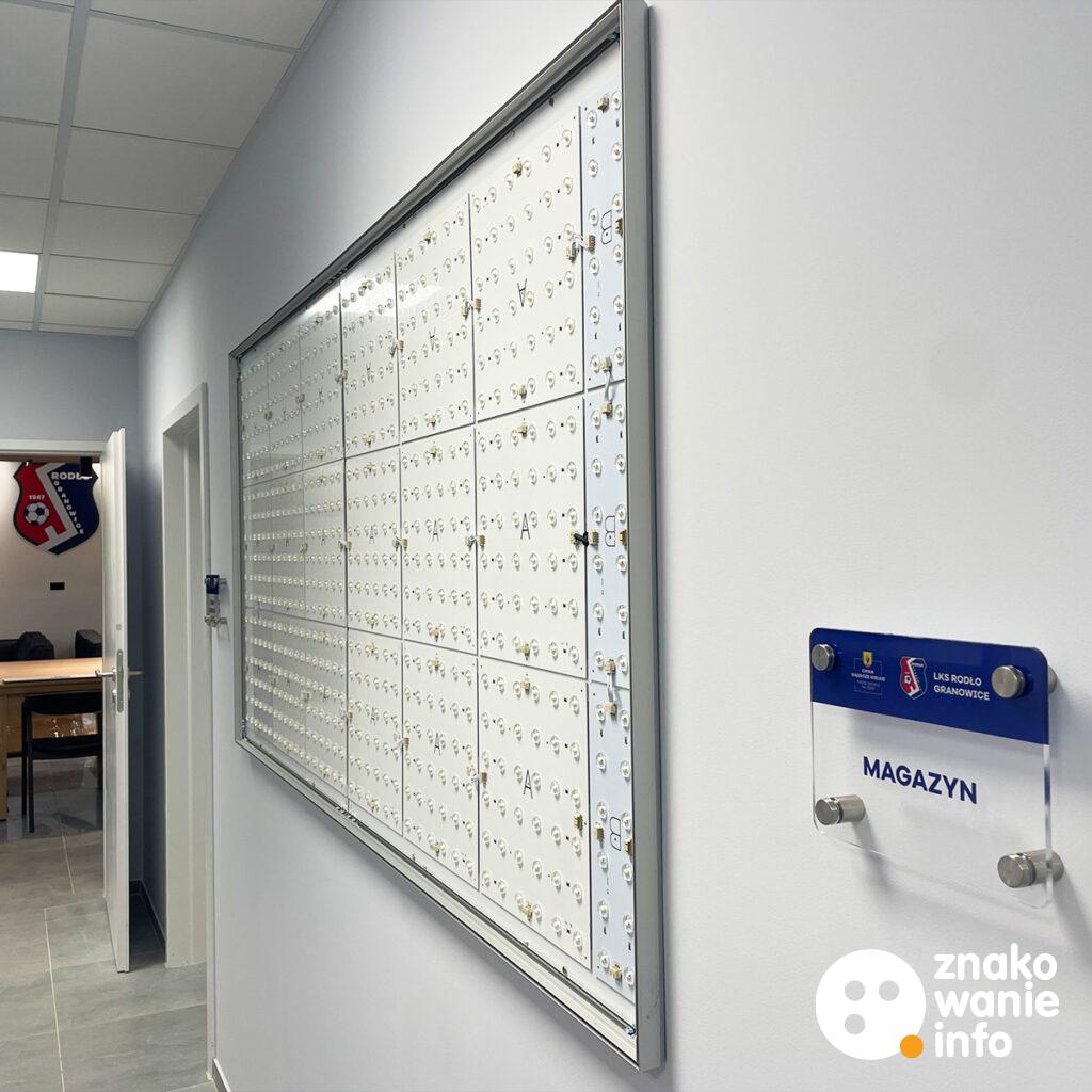 W ramach kompleksowego oznakowania dla LKS Rodło Granowice wykonaliśmy m.in.: tabliczki i tablice informacyjne, magnetyczną tablicę trenerską, liternictwo naścienne oraz szyldy, a także podświetlaną tablicę ze zdjęciami drużyny dawnych lat.