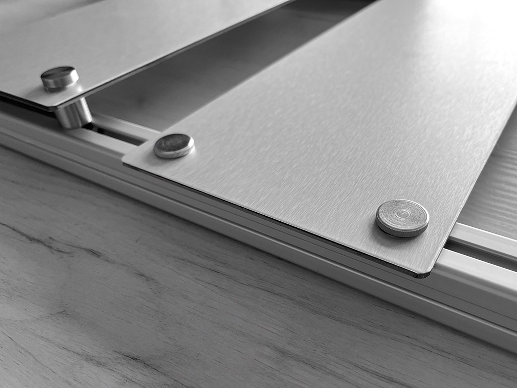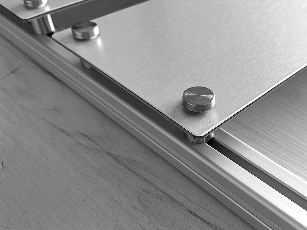 System oparty jest na profilach aluminiowych anodowanych, które nadają całości elegancki, nowoczesny wygląd i gwarantują trwałość. Tablice informacyjne posiadają specjalnie przygotowane otwory oraz bezpieczne, zaokrąglone narożniki, co zapewnia wygodę użytkowania i estetykę. Montaż tablic w profilach odbywa się za pomocą specjalnych śrub zaciskowych, co umożliwia szybkie wymiany i przestawianie poszczególnych elementów.