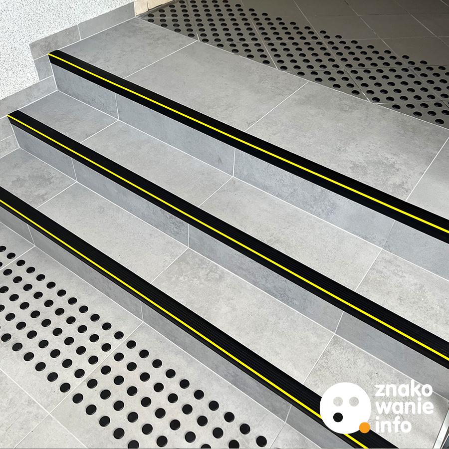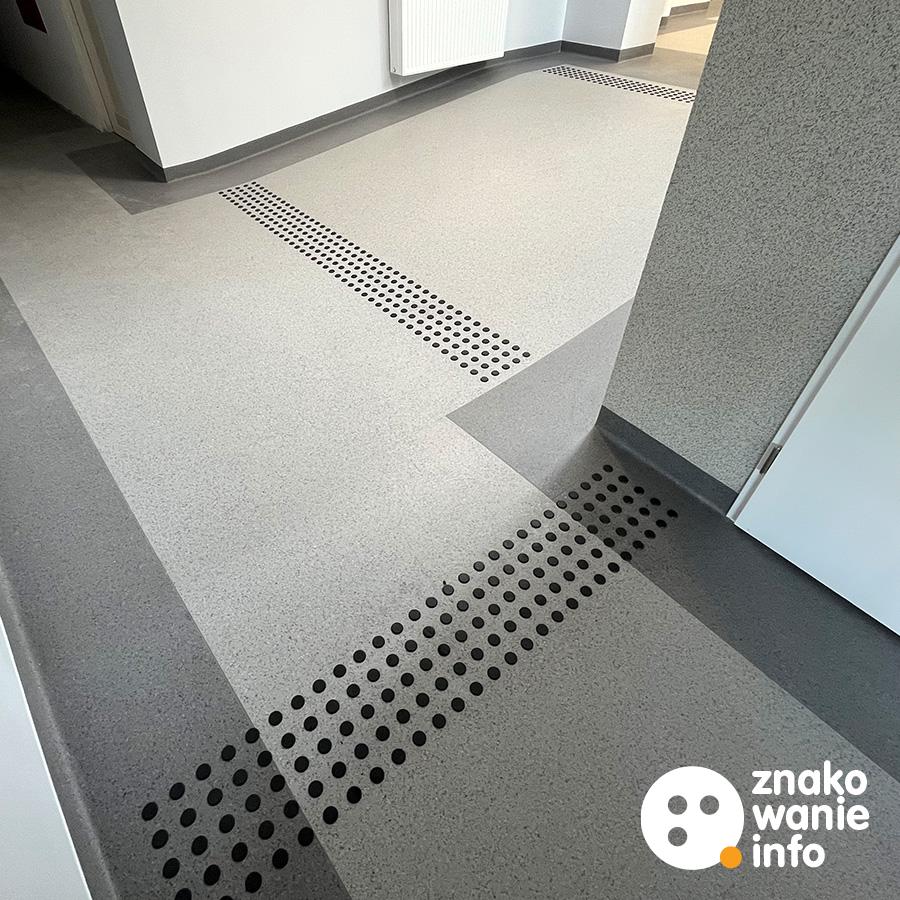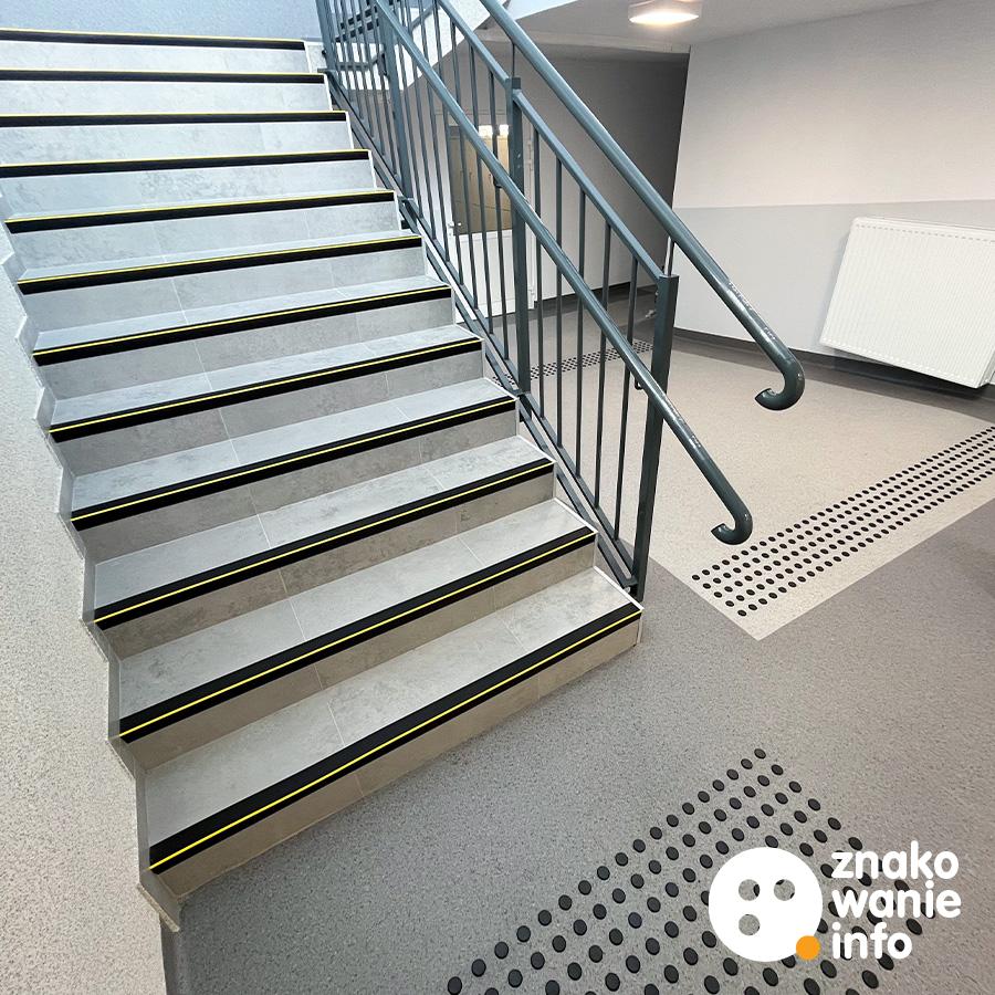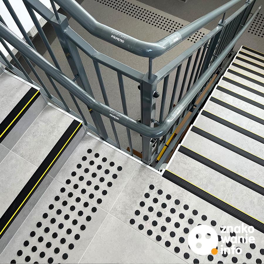 W ramach zwiększenia dostępności w budynku wykonaliśmy m. in. etykiety z alfabetem Braille’a na poręcze, kontrastowe profile na schody o właściwościach antypoślizgowych, a także oznakowanie poziome – ścieżki naprowadzające dla niewidomych.